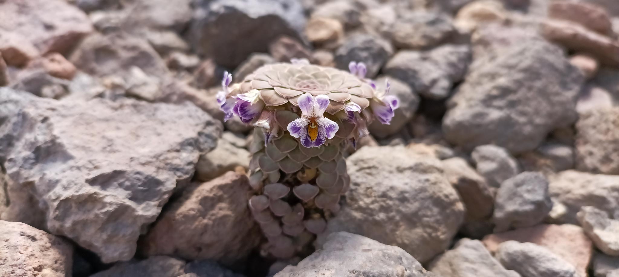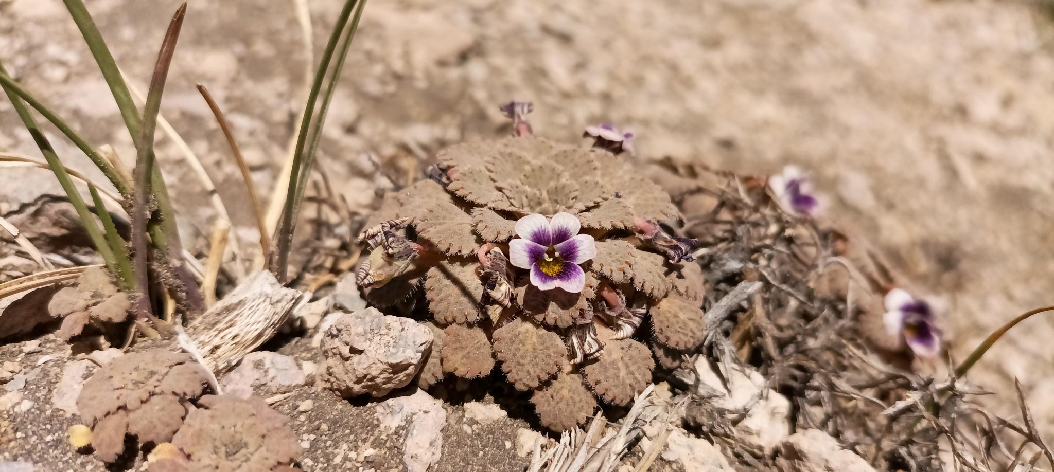 Quizás el hallazgo más fascinante para el observador atento son las Violas rosuladas (Viola de la sección Andinium). A diferencia de las violetas de jardín, estas plantas han evolucionado para mimetizarse con el entorno rocoso. Sus hojas se disponen en rosetas concéntricas, a menudo con colores grisáceos o marrones que las hacen invisibles al ojo inexperto (fenómeno conocido como cripsis).
