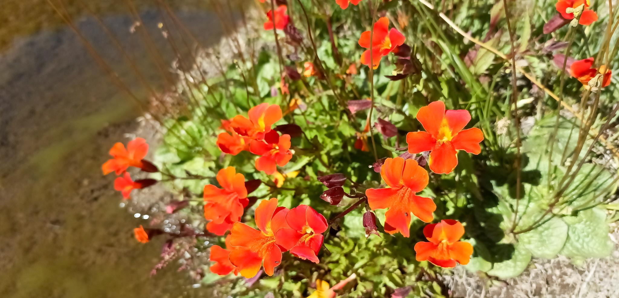 Erythranthe cuprea, una especie que contrasta con las aguas de las vertientes andinas y el verde de la vegetación de las vegas. Joao de la Cruz.
