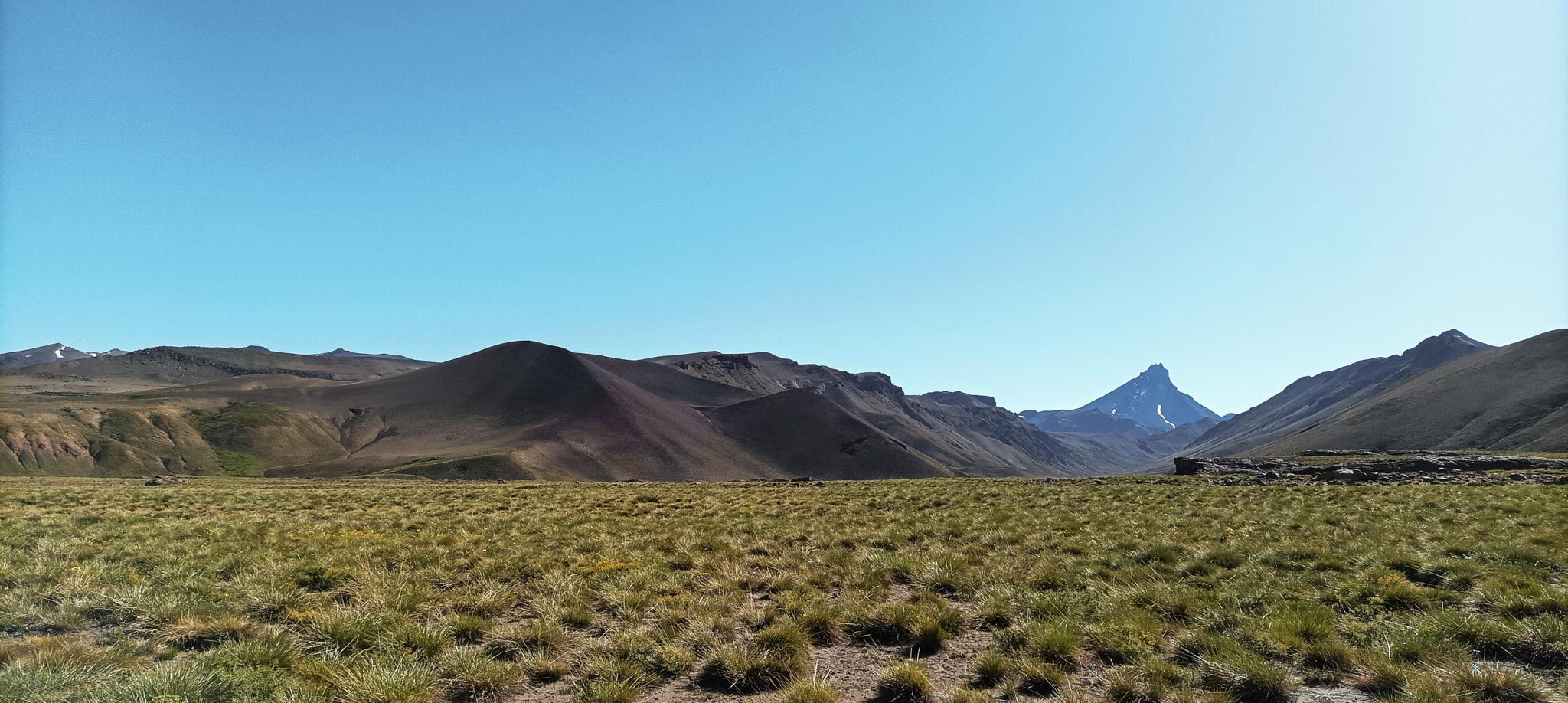 Paisaje dominado por coirones. De fondo el volcán Campanario. Joao de la Cruz.